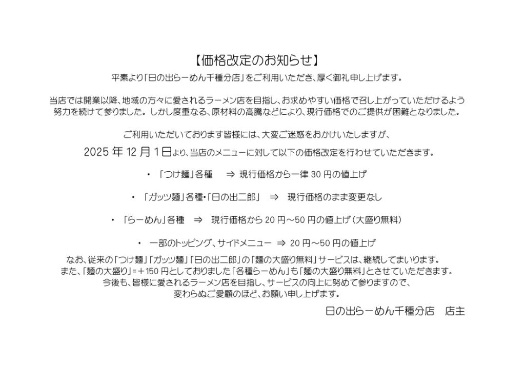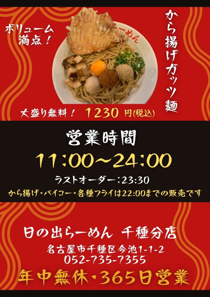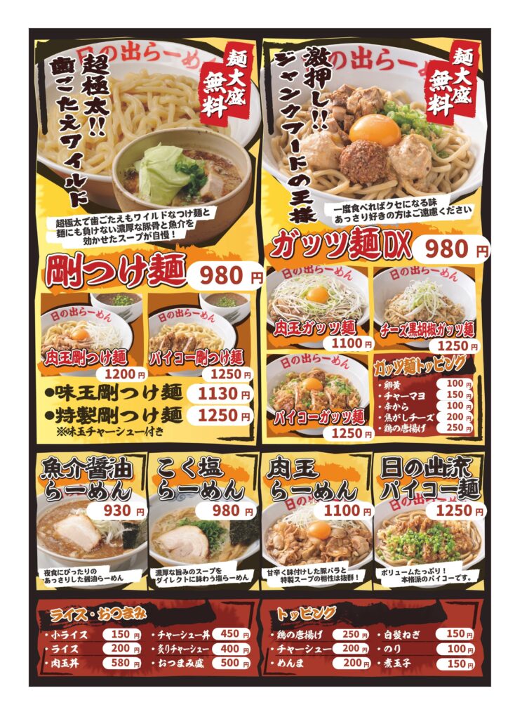 日の出らーめん千種分店メニュー(2024年6月現在)