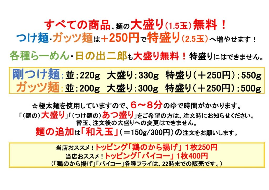 麺の「大盛り」(300g)無料!+200円で「特盛り」2.5倍(500g)