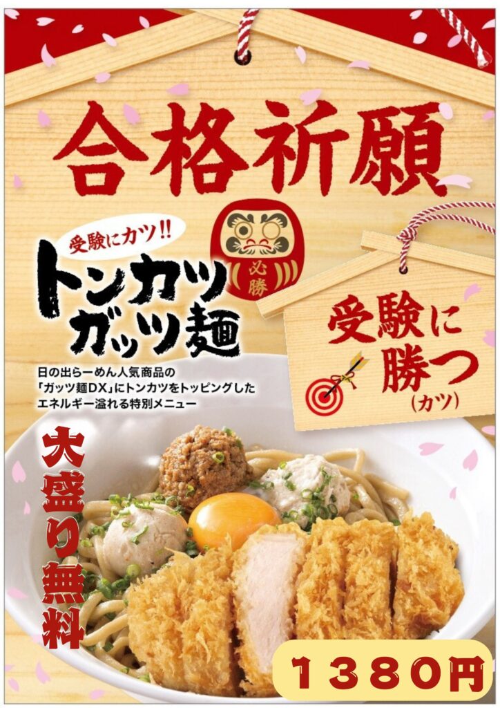 『合格祈願、受験にカツ!!トンカツガッツ麺』1380円 大盛り無料!