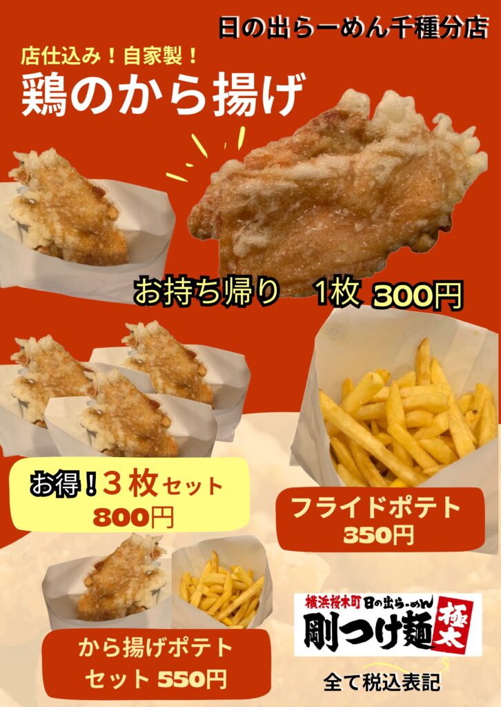 2025年12月から、「鶏のから揚げ」のお持ち帰りを始めました。従来はラーメンへのトッピングのみのご提供でしたが、ご要望にお応えし、「鶏のから揚げ」のみの販売をします。