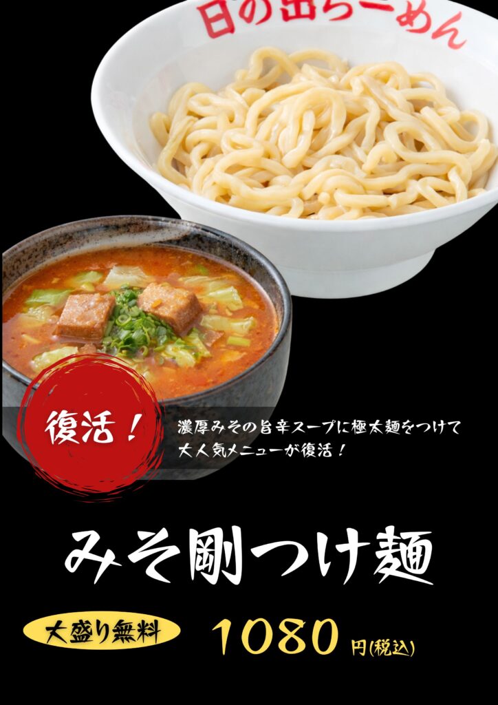 2026年3月から販売開始!【復活!】「みそ剛つけ麺」1080円 2026年3月1日 カテゴリー: 未分類 管理者 濃厚みその旨辛スープに、極太麵をつけて召し上がりください。人気メニューが復活です。麺の大盛り(1.5玉)も無料です。+250円で特盛り(2.5玉)に変更できます。